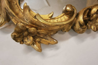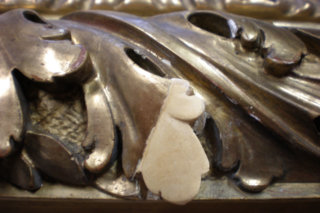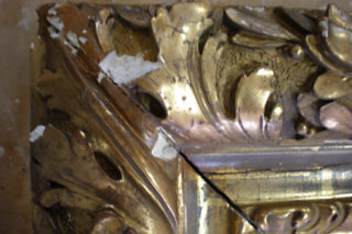 Die Fehlstellen und Risse in den Gipsapplikationen des Bilderrahmens sind auf Trocknungsprozesse und damit Spannungsaufbau zwischen den unterschiedlichen Materialien zurück zu führen. Der Holzrahmen als Träger und die vergoldeten Gipsapplikationen arbeiten unterschiedlich bei klimatischen Schwankungen. Die Folge sind stetige Verluste einzelner Details wie Blattspitzen.