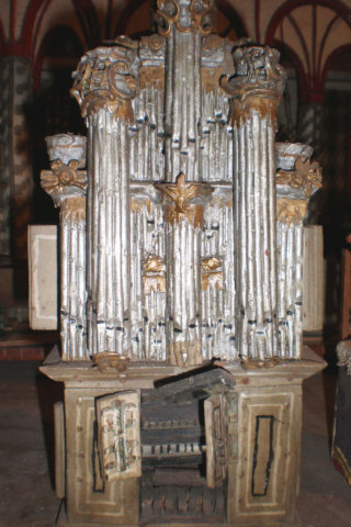 Detail der Innenausstattung zeigt das alte, heute nicht mehr vorhandene, Orgelprospekt. Maßnahmen: Reinigung von dicken Staubablagerungen, Ergänzung vieler fehlender Details wie Dachschindeln und Zaunteilen, Installation einer Innenbeleuchtung, etc.