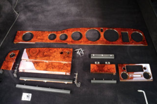 Armaturbrett, Radioverkleidung und Handschuhfach nach der Restaurierung, Holzarmaturen Nussbaum furniert, hochlganz lackiert